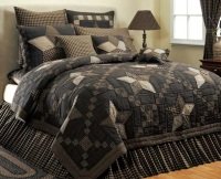 | Farmhouse Star is a primitive pattern that showcases large patchwork stars amid deep tones of gunmetal gray and tan. Available in bedding, window treatments, shower curtains, and kitchen coordinates. ...Read
